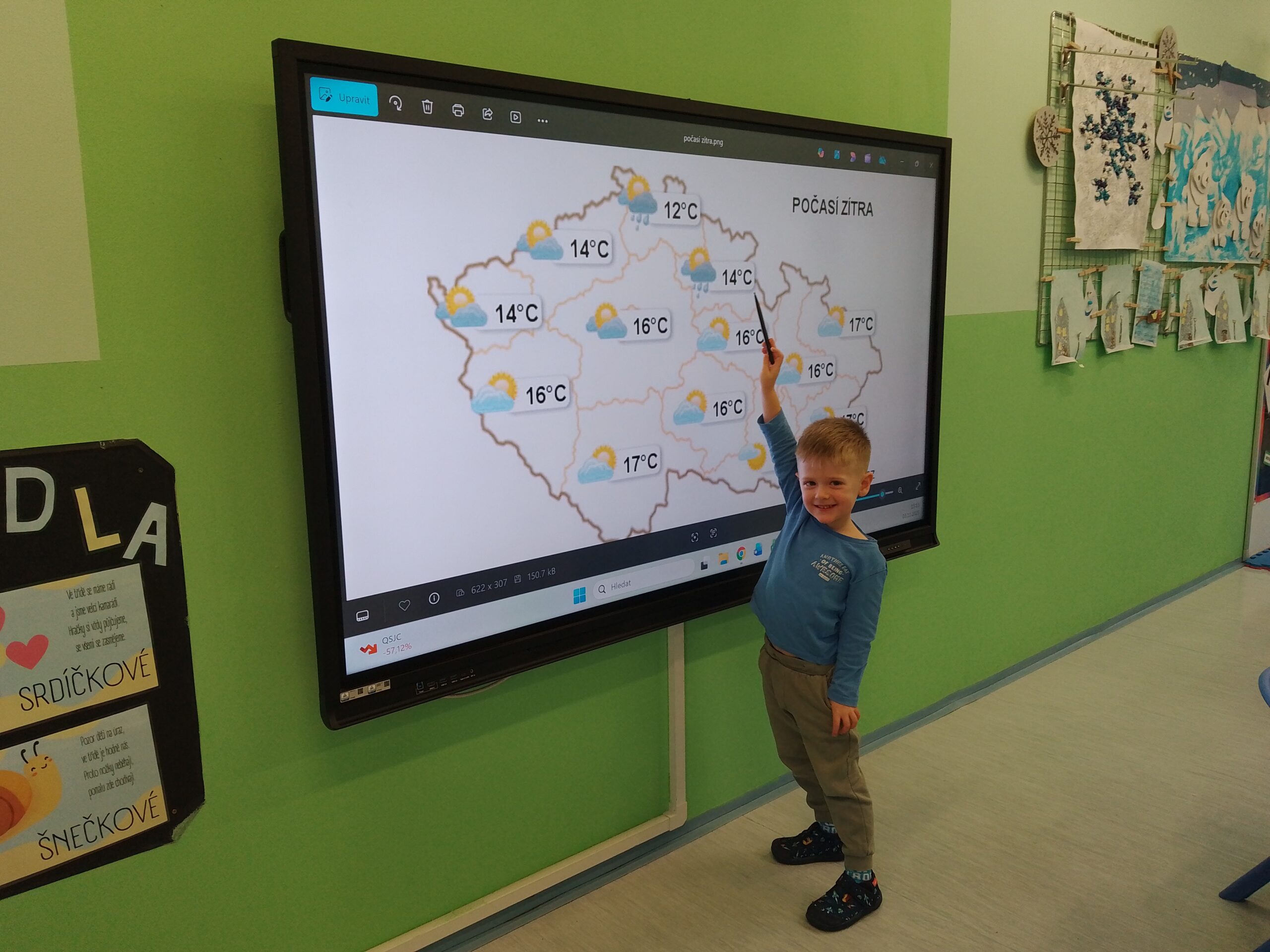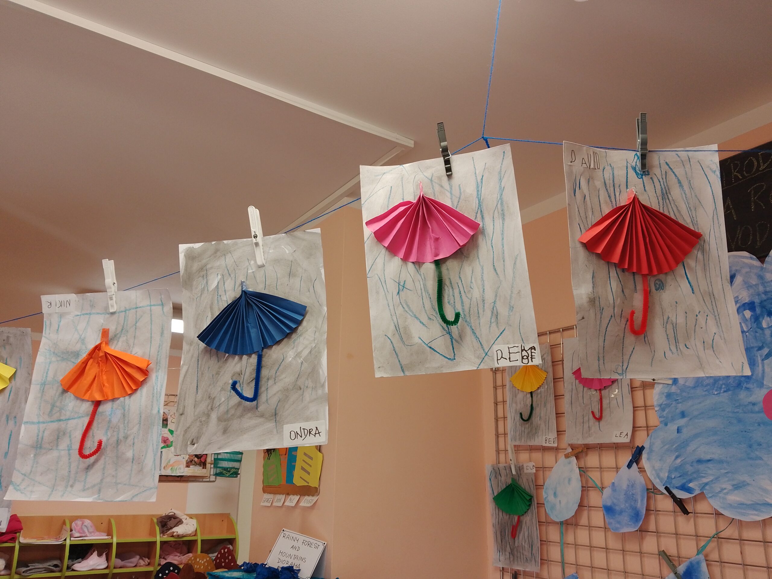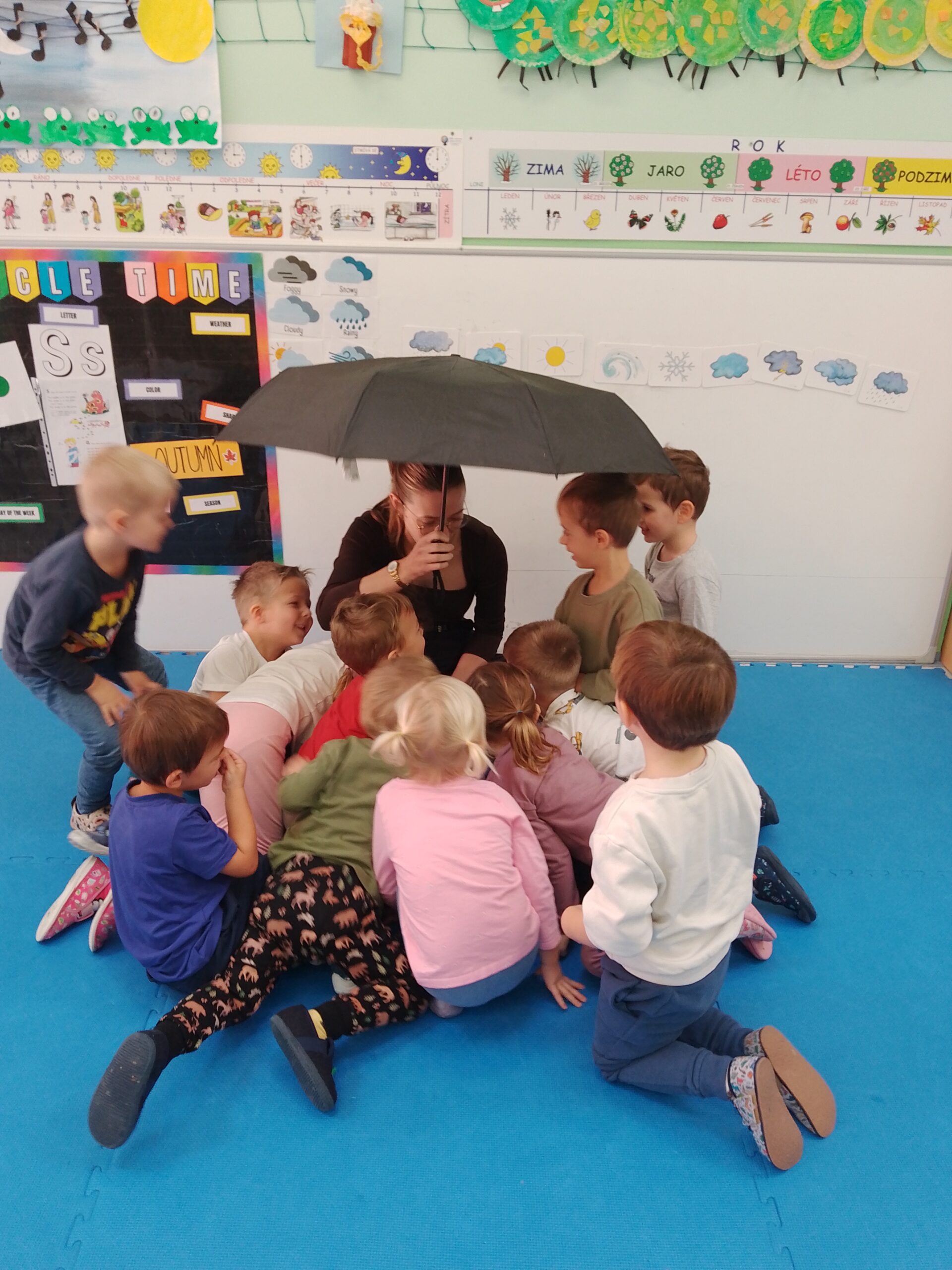 Počasí a roční období. Samozřejmě jsme si zopakovali roční období a vysvětlili si, proč a jak se mění. Všichni jsme si vyzkoušeli, jaké to je předpovídat počasí. Ve školce jsme měli hezkou návštěvu od H2ospodářů s jejich interaktivní kapičkou Jarmilkou a dozvěděli se spoustu informací o vodě a počasí. Pomocí vodovek jsme si vytvořili deštivé počasí a skládačkou jsme vyrobili krásné deštníky. Zpívali jsme světoznámou písničku „Prší prší“ ve zlepšené verzi a naučili se novou básničku o počasí. Podzim se nám nahlásí: Nesu chladné počasí! Ranní mlhy, kapky deště, chcete k tomu vítr ještě? Namaluji listy stromům, pak je sfouknu na zem k domům, udělám z nich nakonec, pěkně pestrý koberec. V příštím týdnu máme další zajímavé téma a to je KOLOBĚH VODY.