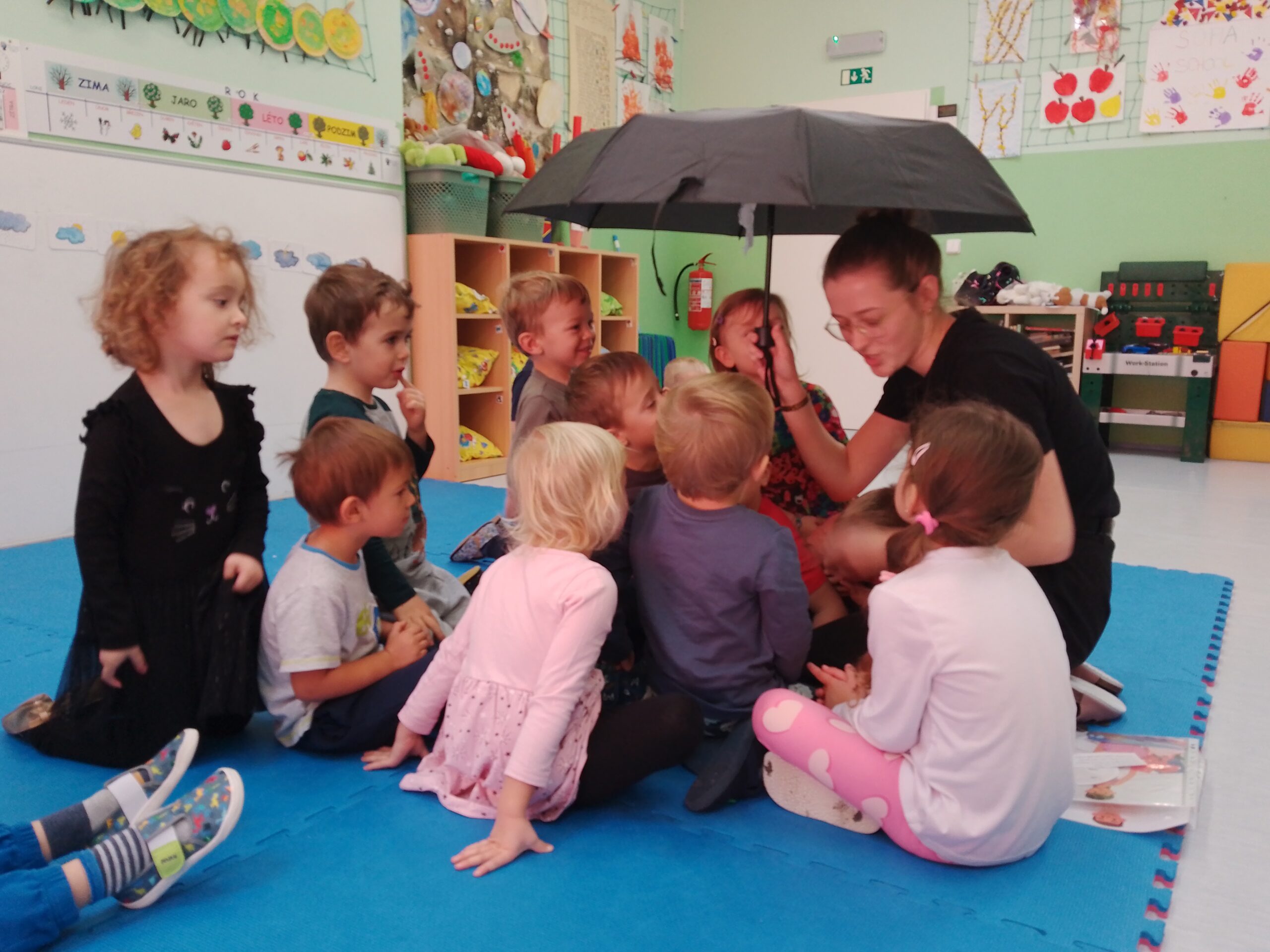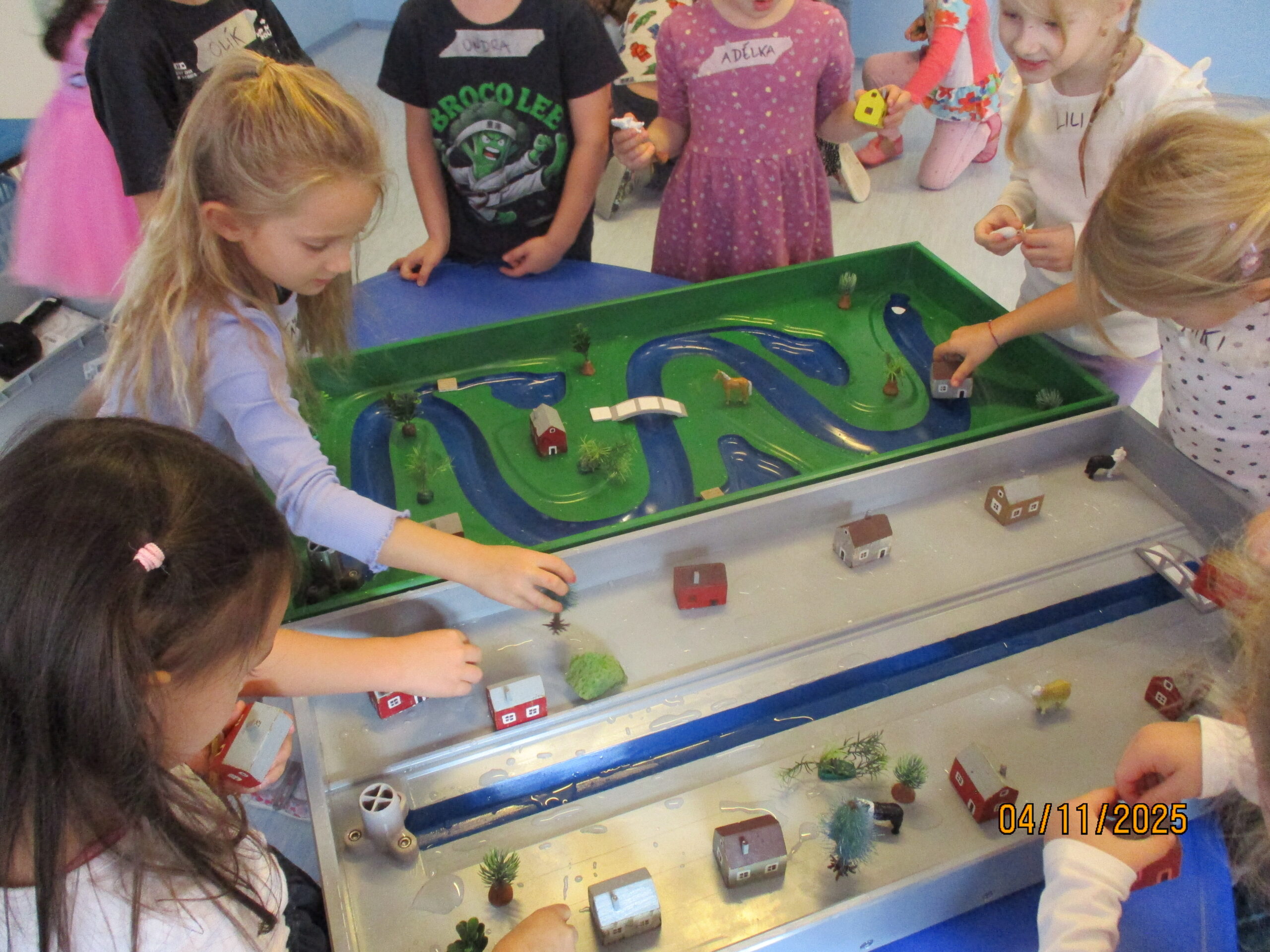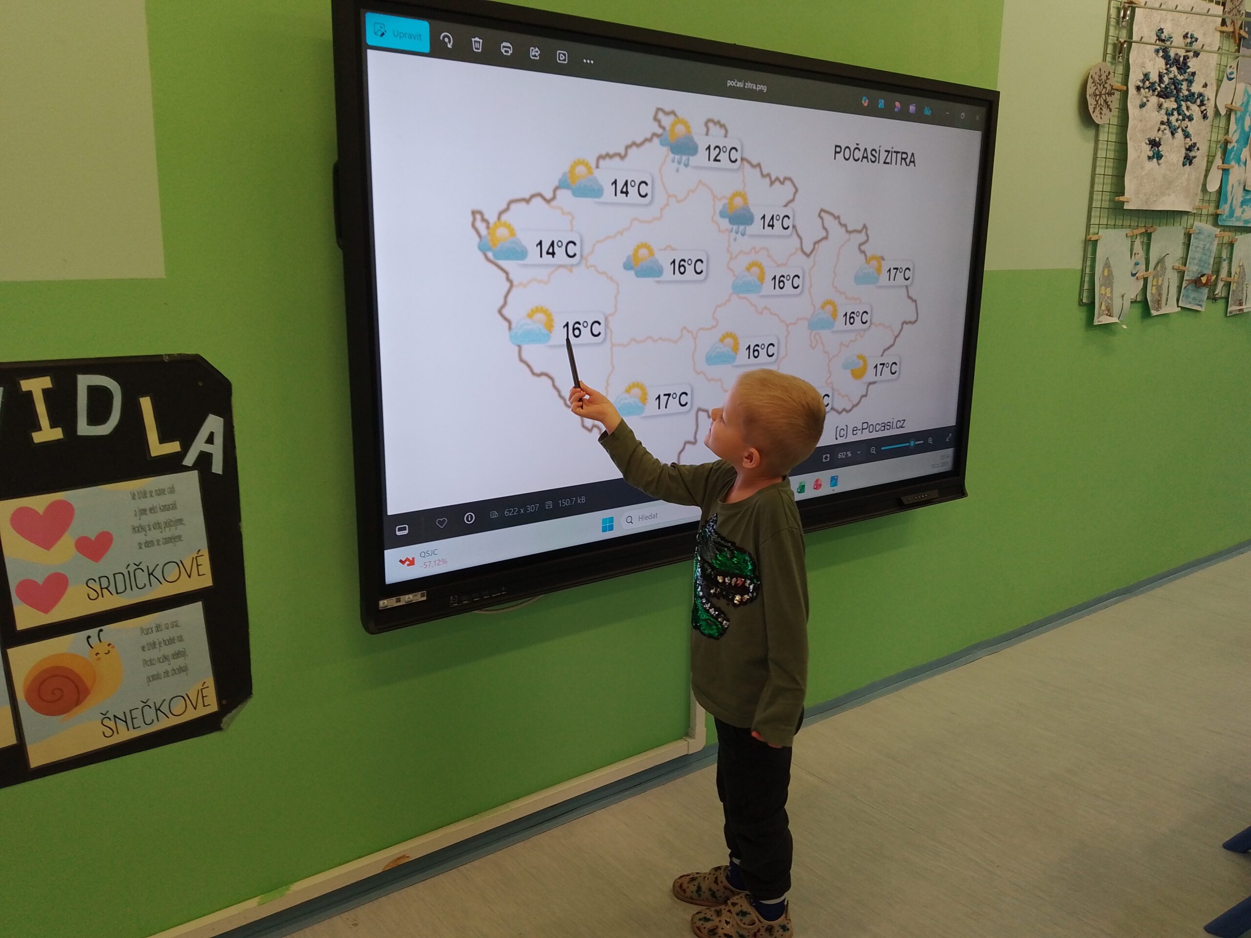 Počasí a roční období. Samozřejmě jsme si zopakovali roční období a vysvětlili si, proč a jak se mění. Všichni jsme si vyzkoušeli, jaké to je předpovídat počasí. Ve školce jsme měli hezkou návštěvu od H2ospodářů s jejich interaktivní kapičkou Jarmilkou a dozvěděli se spoustu informací o vodě a počasí. Pomocí vodovek jsme si vytvořili deštivé počasí a skládačkou jsme vyrobili krásné deštníky. Zpívali jsme světoznámou písničku „Prší prší“ ve zlepšené verzi a naučili se novou básničku o počasí. Podzim se nám nahlásí: Nesu chladné počasí! Ranní mlhy, kapky deště, chcete k tomu vítr ještě? Namaluji listy stromům, pak je sfouknu na zem k domům, udělám z nich nakonec, pěkně pestrý koberec. V příštím týdnu máme další zajímavé téma a to je KOLOBĚH VODY.