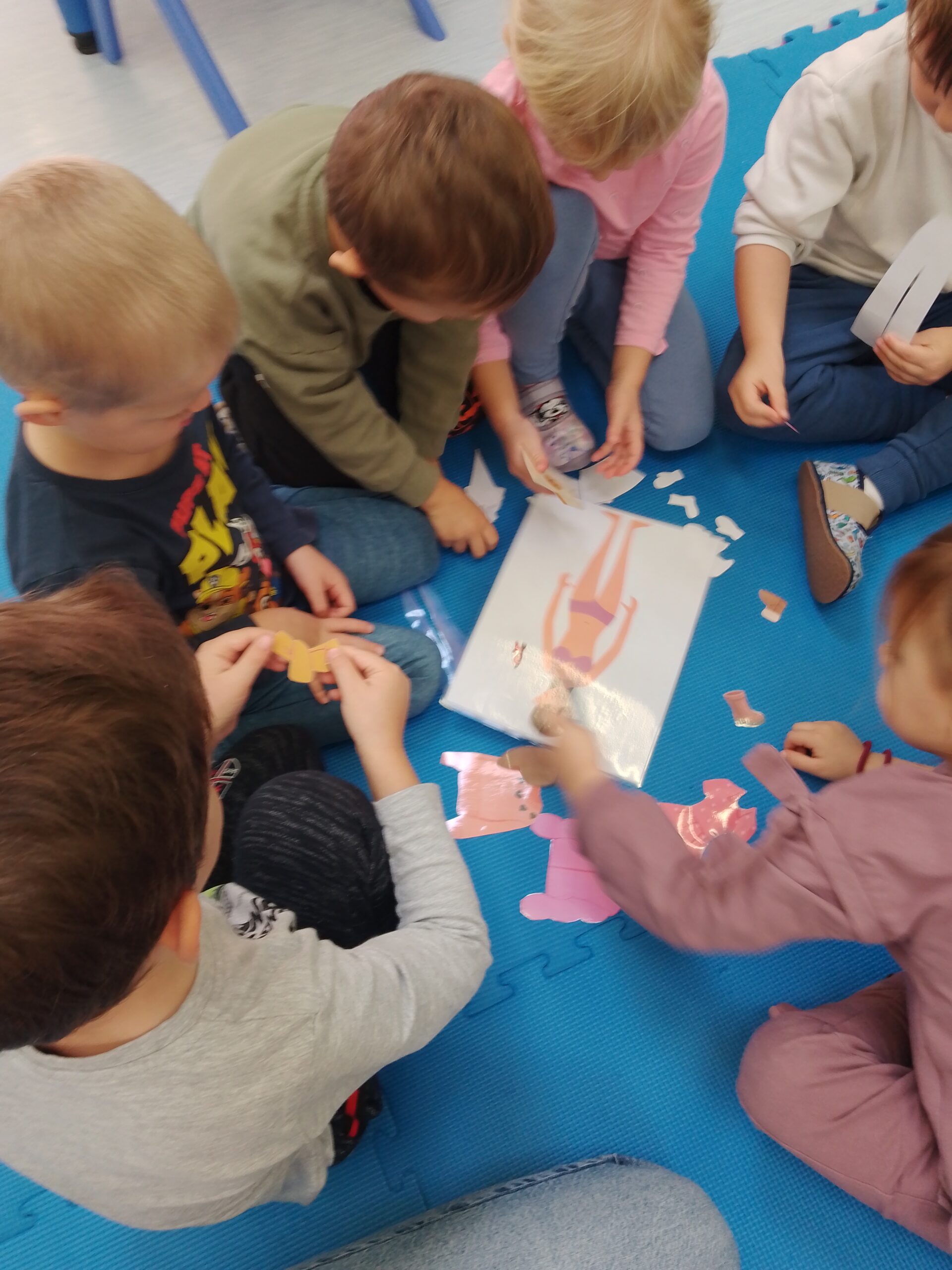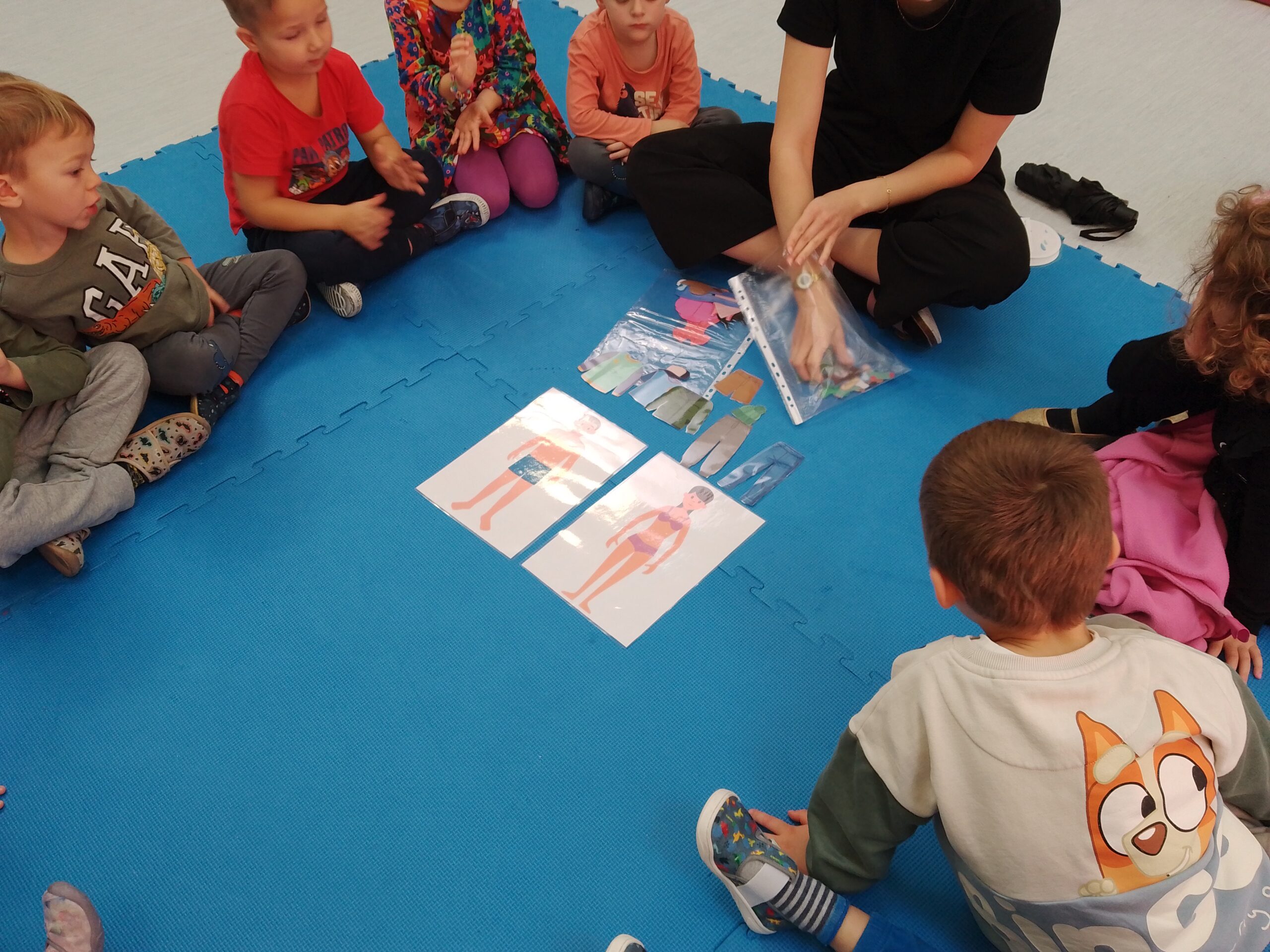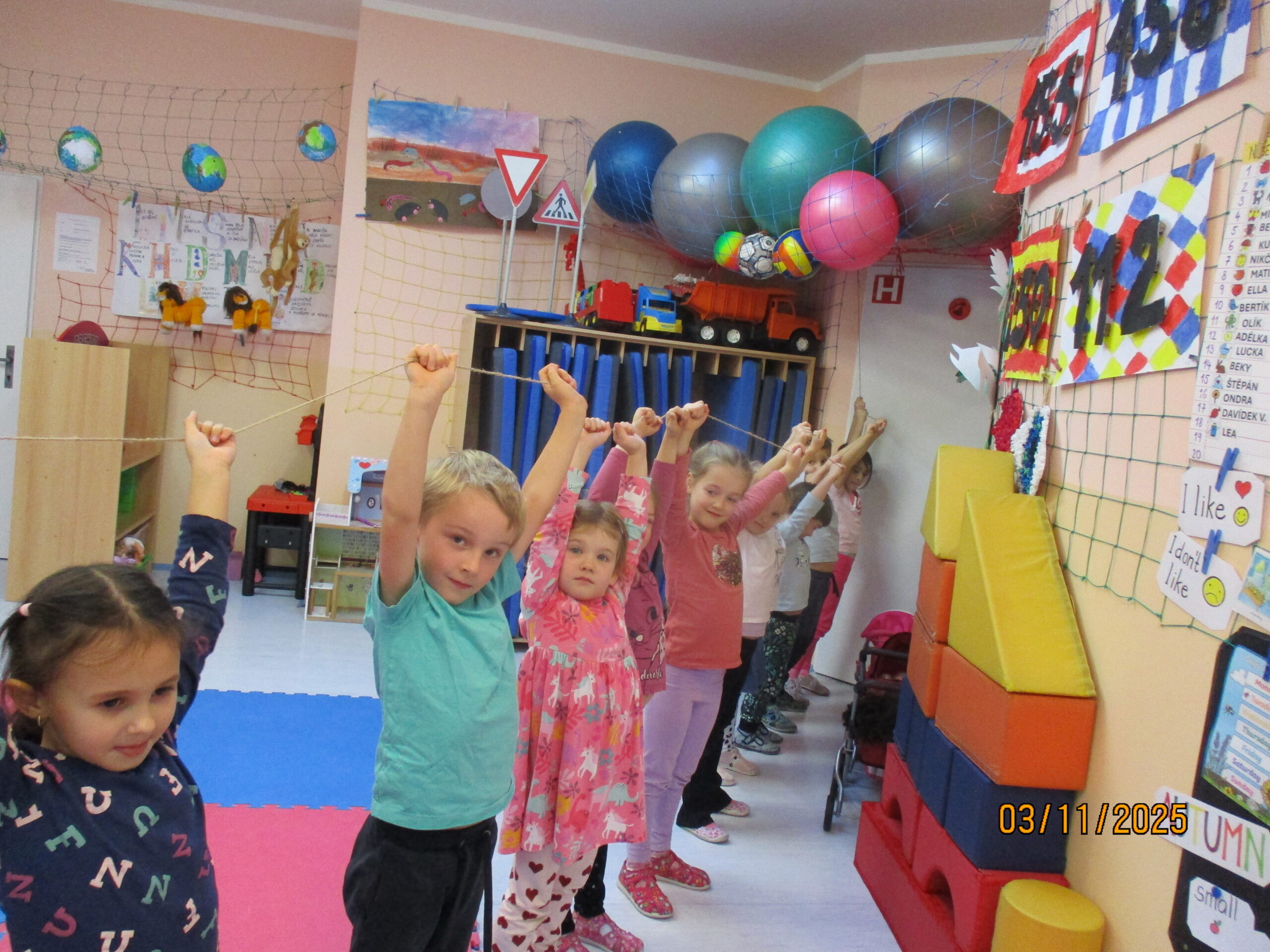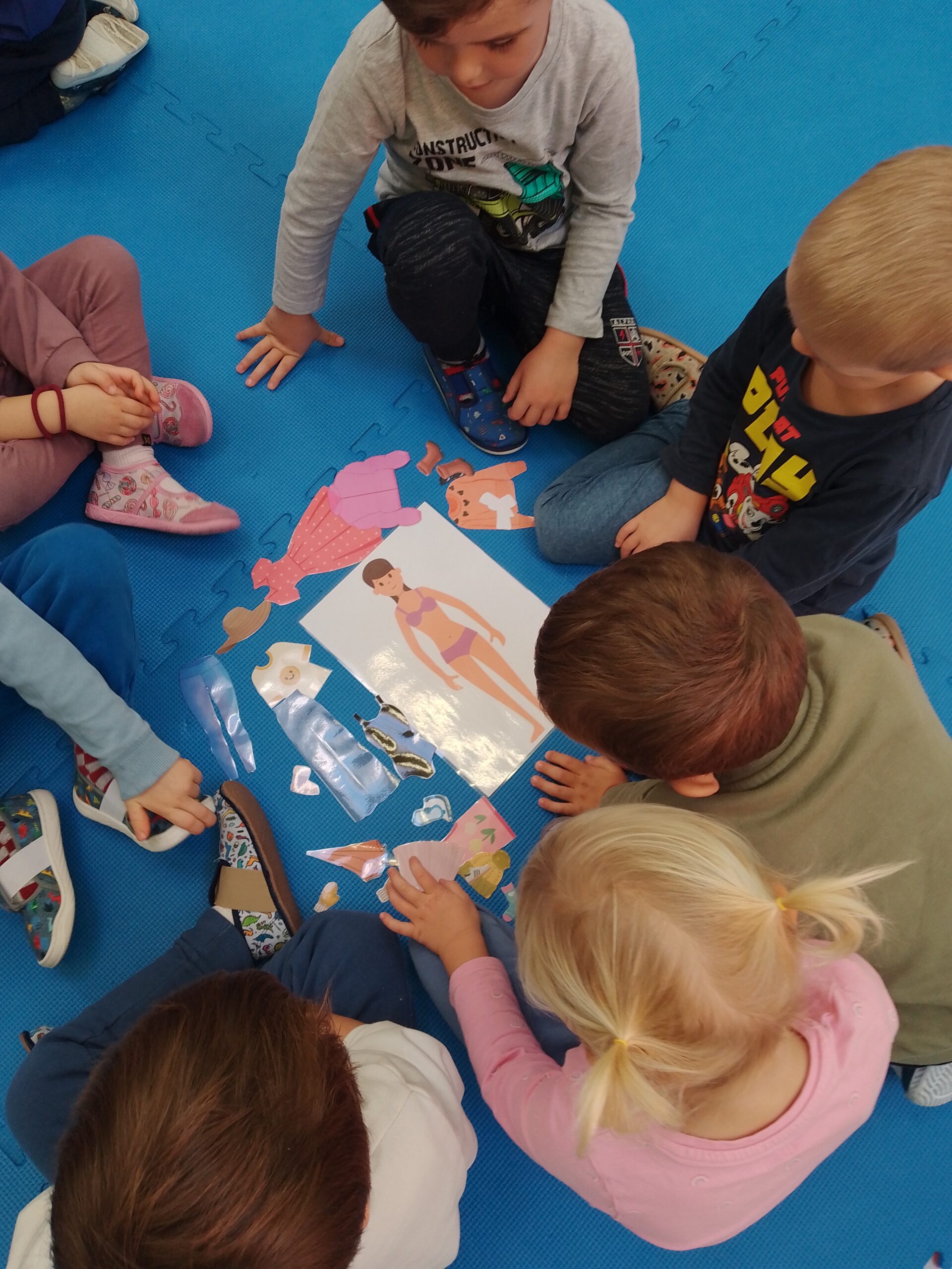 Řekli jsme si, a hlavně jsme si ukázali, jaké počasí venku může být a naučili jsme se pojmenovat všechno oblečení, které si na sebe můžeme obléct. Abychom věděli, co si na sebe v jakém počasí obléct, procvičili jsme si to na postavičkách, které jsme ve skupinkách s dětmi oblékali podle zadaného počasí.