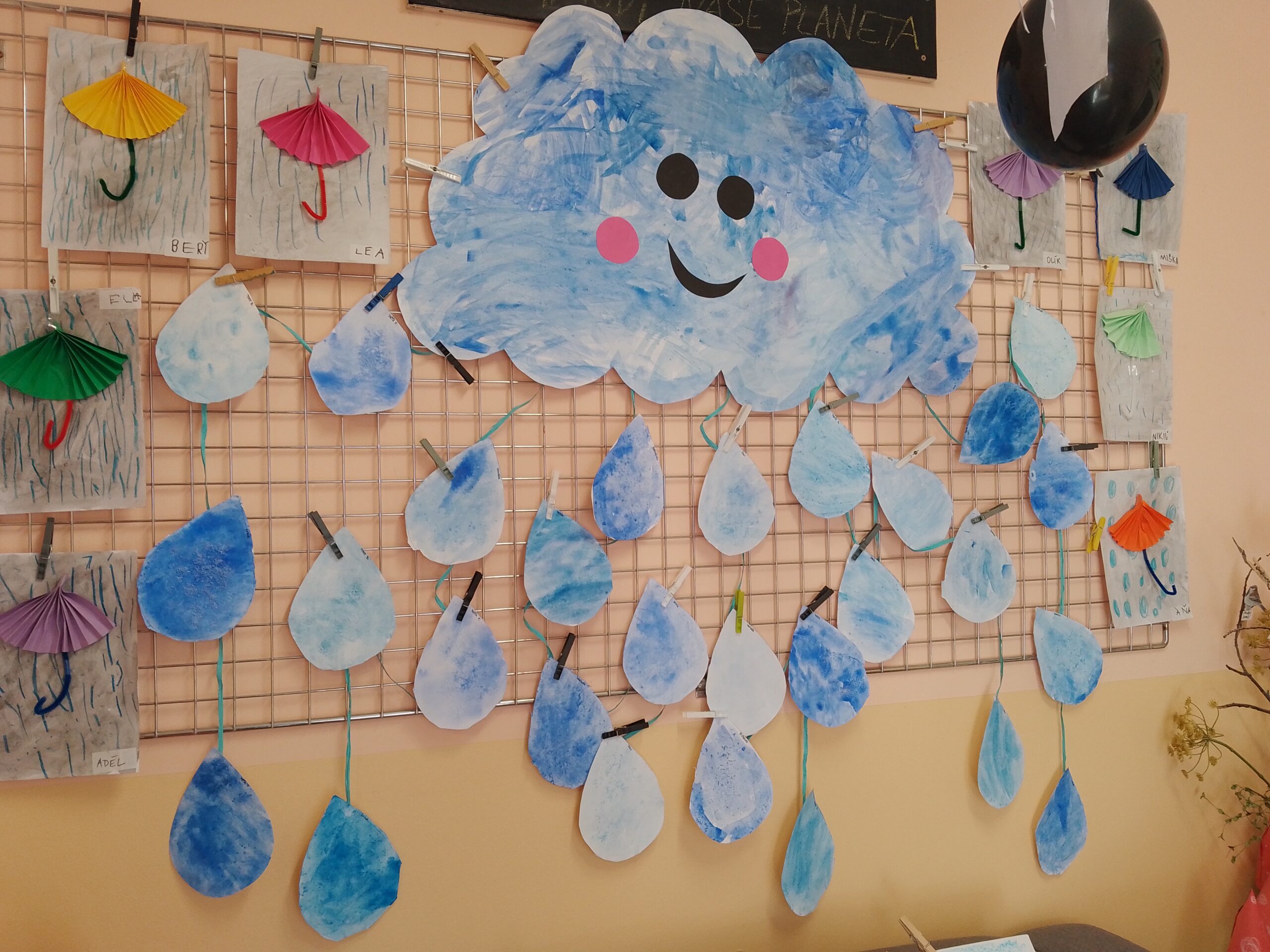 Ve výtvarce jsme si vyrobili velký usměvavý deštivý mrak s kapičkami, které z něj padají. Procvičili jsme si u toho práci s nůžkami, malování vodovými barvami a následně jsme s dětmi kapky nalepili na kousek provázku, který vedl z mraku.