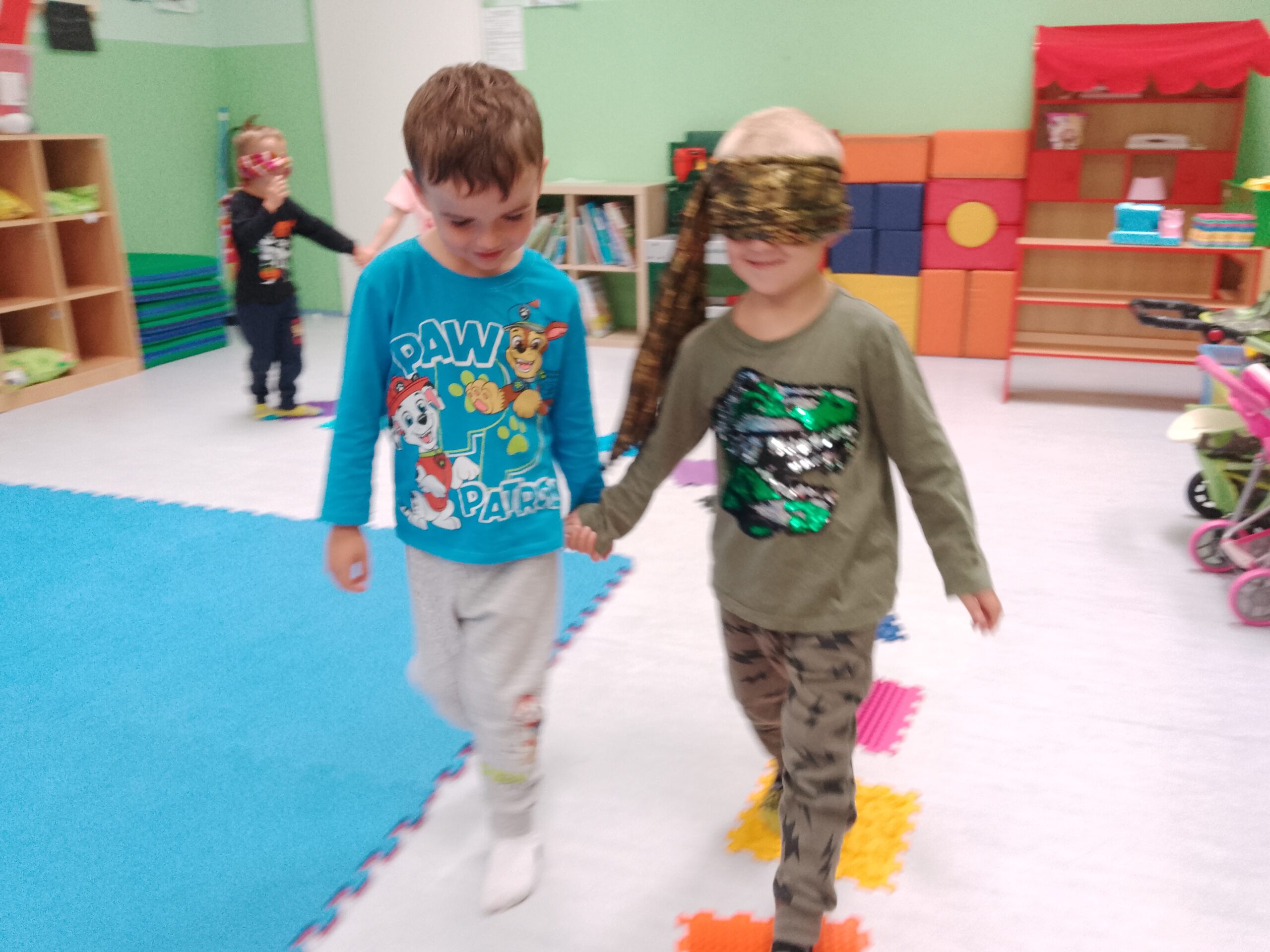 Rozcvička – pohyby jako smysly. Opičí dráha ve dvojicích se zavázanými oči a pohybová hra „Zmuchlaný papír“.