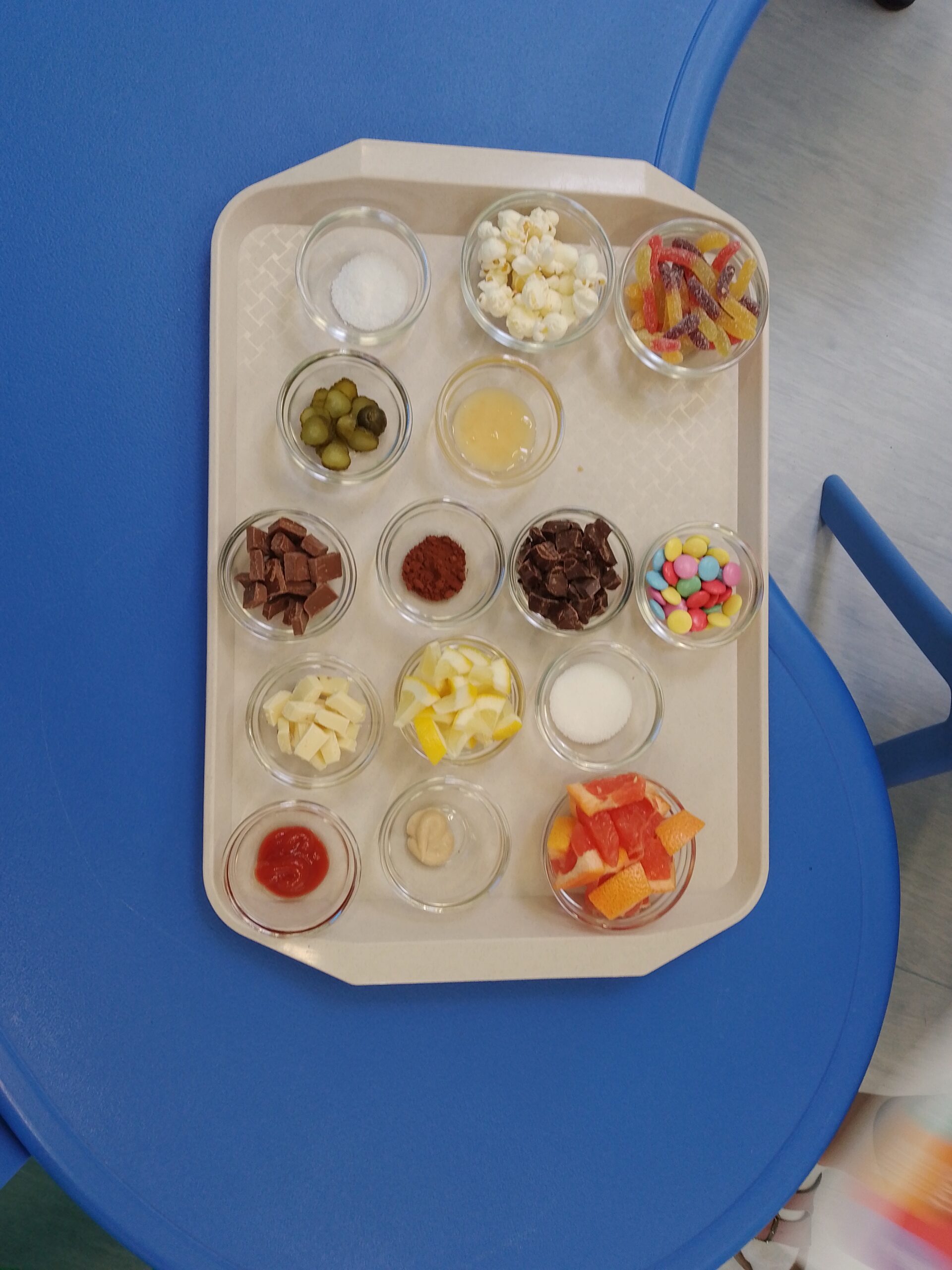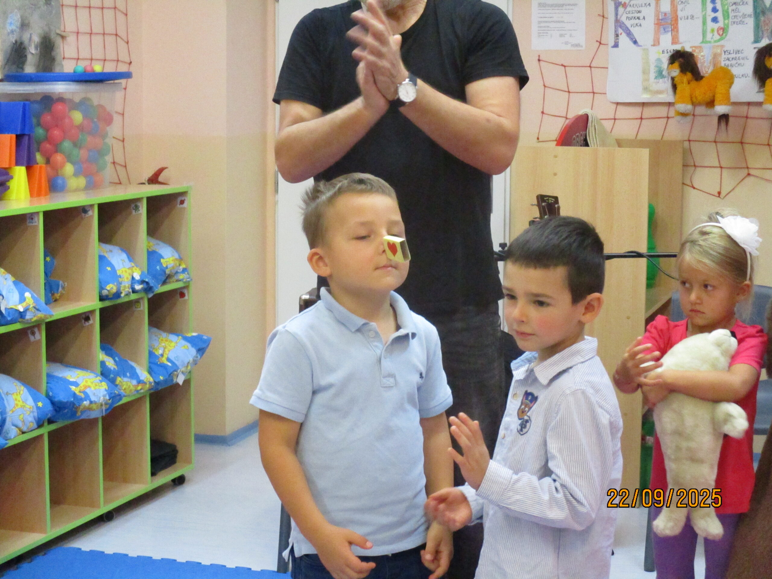 Básnička, která nás provázela celým týdnem poznávání smyslů. Abychom si procvičili sluch, poznávaly jsme různé zvuky, které se v našem okolí nachází. Na chuť jsme si připravili ochutnávku, která nám pomohla s rozpoznáním sladké, slané, hořké a kyselé chuti. K procvičení zraku jsme vyzkoušeli test zrakové ostrosti a oko jsme si následně i vyrobili. Nakonec jsme podle hmatu poznávali různé předměty a učili jsme se jednoduchým způsobem zacházet s nůžkami.
